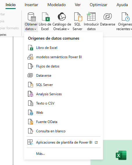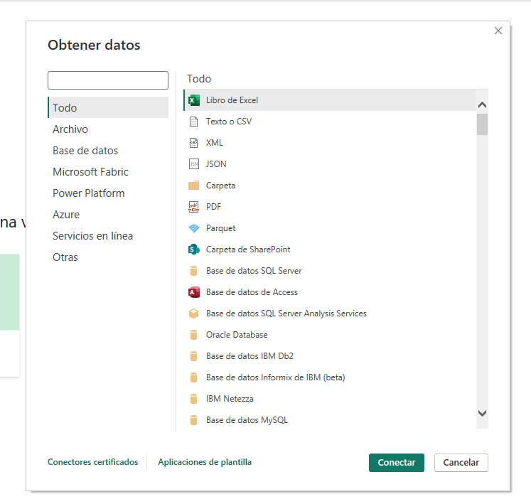 Si el origen que necesitas no aparece en esta lista rápida, puedes hacer clic en “Más…”. Se abrirá un menú de búsqueda con todas las opciones disponibles, desde bases de datos hasta servicios en la nube como SharePoint, Google Analytics o Azure.