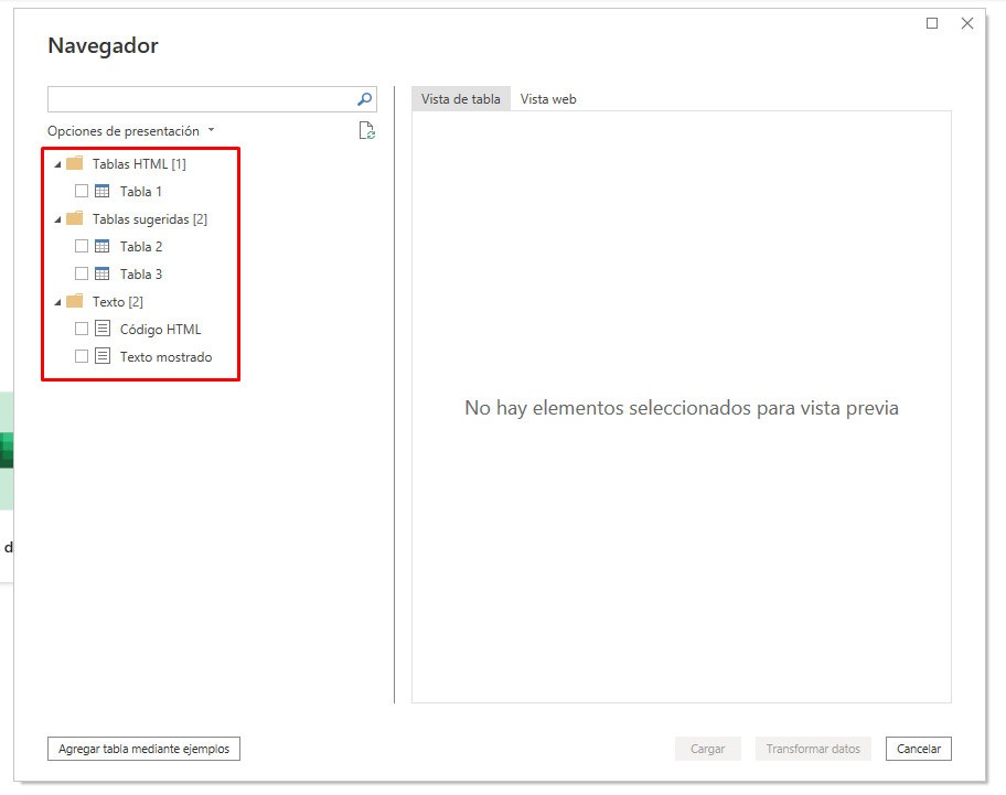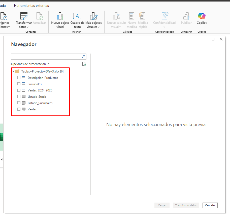 Una vez lo selecciones, Power BI mostrará las tablas. En el caso de un archivo Excel, pueden aparecer tablas y hojas, en este caso siempre es recomendable seleccionar la tabla por dos razones: