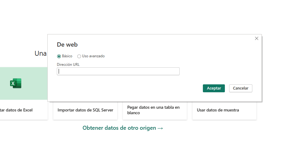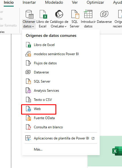 Otra opción muy interesante es importar datos desde una dirección web. Para ello, selecciona “Web” en el menú de “Obtener datos”.